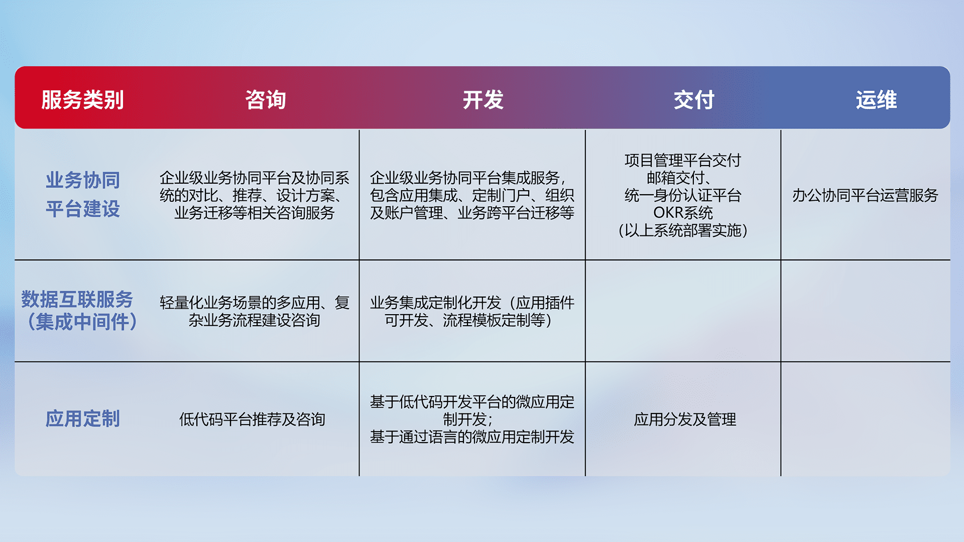 针对钉钉、、企微、、IDaas等平台级产品提供产品的规划、、方案、、交付、、、、定制化开发等服务,,,实现如统一协同办公、、智能客户服务、、、、混合会议管理、、、智能数据查询、、等业务场景,,,实现数字化转型。。。