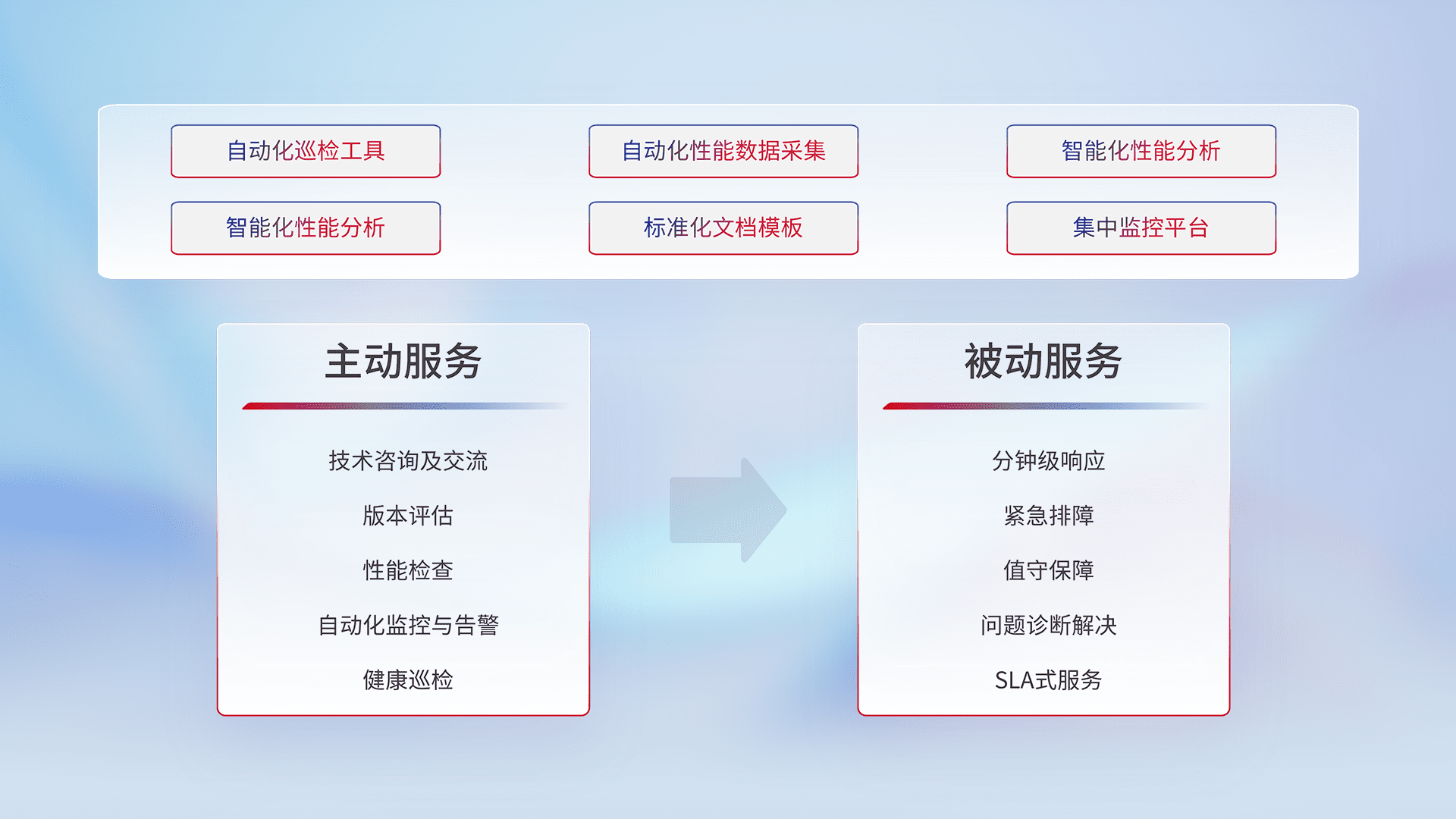 智能化工具和标准化文档,,,保障服务质量,,,,提供主动服务(包含技术咨询、、、版本评估、、、、性能检查、、、自动化监控与告警、、、健康巡检)和被动服务包含(分钟级响应、、、、紧急排障、、、值守保障、、问题诊断解决、、SLA服务)。。